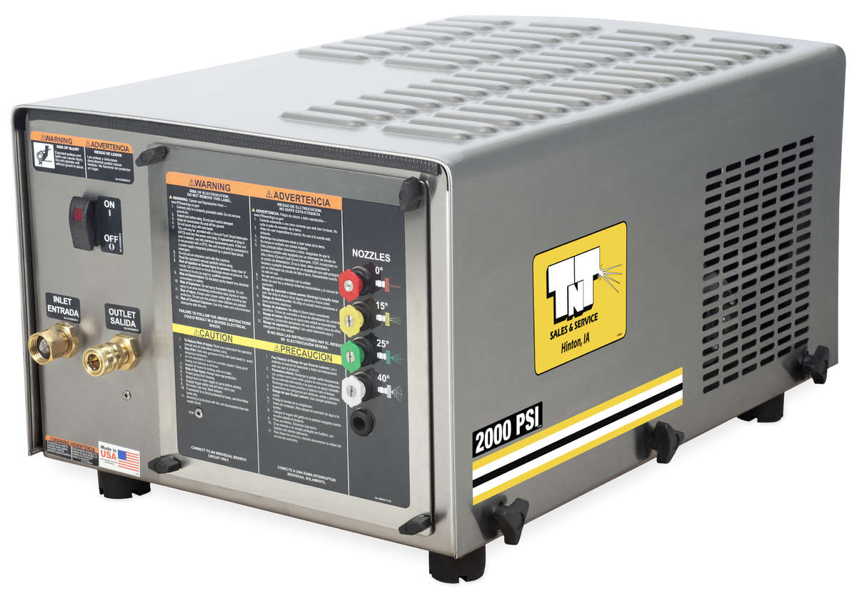 This stationary pressure washer is designed to be used in wash bays and restaurants to keep equipment clean.