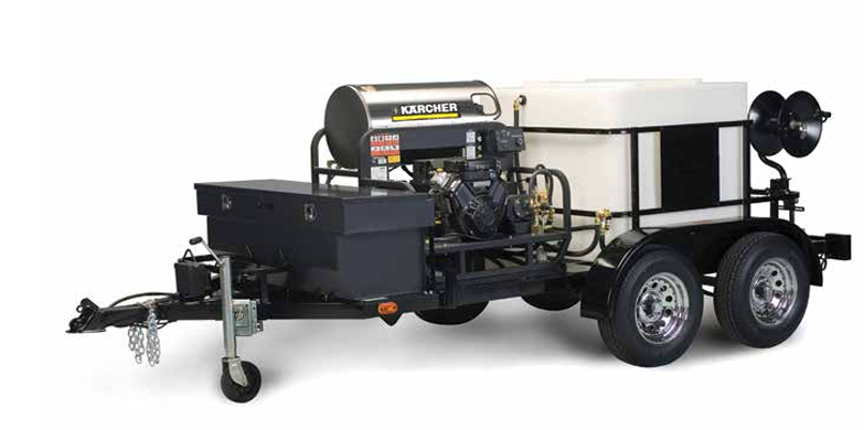 Choose a compatible skid-mounted hot water pressure washer for the dual-axle TRK-6000 trailer. The trailer comes with a 330-gallon water tank.